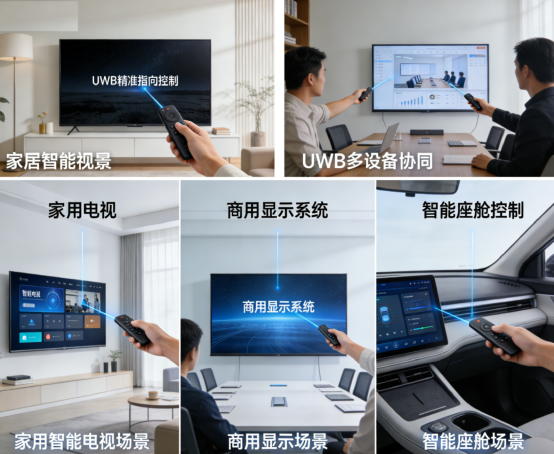 UWB技术通过双向飞行时间(TW-TOF)测距与多天线到达角度(AoA)测角的组合,同时搭配IMU实时姿态采集数据,深度融合后赋能指向性遥控器产品,重构人机交互新体验,打破传统操控边界,实现“指哪控哪”的精准交互,为家庭、商用、车载等多场景提供更智能、更便捷的操控解决方案。